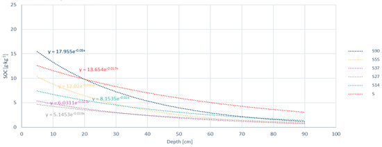Rates of SOC content reduction with soil depths (exponential fitting was employed to highlight the trends).