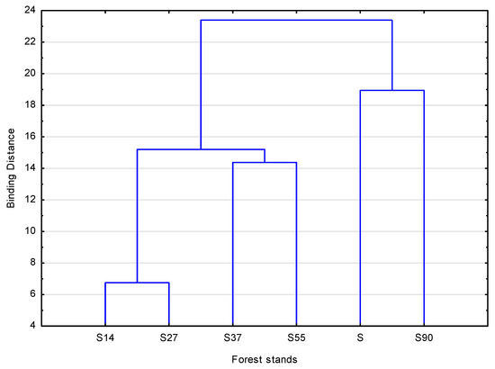 Hierarchical classification (Figure 4) illustrates that soils with the lowest SOC content (S27 and S14) were the most similar, forming a distinct group. Another group included soils of the older stands (S37 and S55), while the most divergent soils were those from S90 and S. This indicates a significant impact of forest stand age on SOC accumulation, with older stands accumulating substantially more SOC.