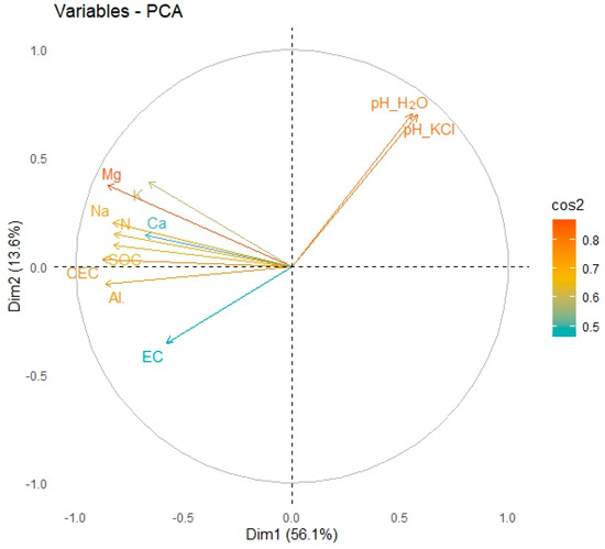 Principal Component Analysis correlation circle. Each vector’s length represents the contribution of a variable to PC1 (Dim1) and PC2 (Dim2) principal components. The angle between the vectors indicates the correlation between the given variables: close to 0 degrees for strong positive correlation, close to 180 degrees for strong negative correlation, and close to 90 degrees for weak or near-zero correlation. A color scale based on cosine squared (cos2) was added to better visualize the variable’s total variance, as explained by PC1 and PC2.