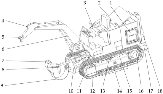 Schematic diagram of the first-generation tree transplanting machine structure. (1) Engine; (2) Engine Bay; (3) Operator’s Cab; (4) Small Boom; (5) Telescopic Boom; (6) Large Boom; (7) Vibration Excavation Device Bracket; (8) Lower Insertion Blade; (9) U-Shaped Blade; (10) Torsional Vibration Device; (11) Guide Wheel; (12) Tracks; (13) Chain Wheels; (14) Load-Bearing Wheels (supporting section of tracks); (15) Chassis; (16) Drive Wheel; (17) Support Block; (18) Support Device Bracket.