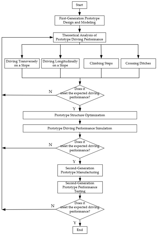 The first step involves a comprehensive theoretical analysis of the driving performance of the first-generation tree transplanting machine. This yields the relationship between the center of gravity offset distance and the overall stability and passability of the machine. Following this, a structural optimization plan for the prototype is proposed. The optimized prototype then undergoes rigorous simulation and evaluation for expected driving performance. Finally, the optimized second-generation prototype is manufactured and tested for driving performance in a forest environment, as depicted in Figure 2.