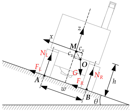In Equation (1), h is the vertical height from the centroid to the ground. w is the track width. θ is the terrain slope. cx is the offset distance of the center of gravity relative to the centroid in the lateral x-axis direction, and cz is the offset distance relative to the centroid in the vertical z-axis direction.