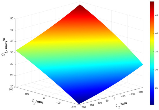 Since θL is only related to the coefficient of adhesion to the ground and not to the structural parameters of the machine, we further discuss the relationship between θL-max and cx, cz, and w. By substituting the structural parameters w and h into Equation (3), we can get the surface relationship, as shown in Figure 4. When cx is constant, θL-max is inversely proportional to cz; when cz is constant, θL-max is directly proportional to cx. Therefore, this trend indicates that shifting the machine’s center of gravity towards the centerline of the left track or downward can improve the stability of lateral driving on the slope.