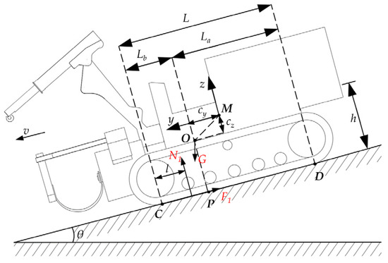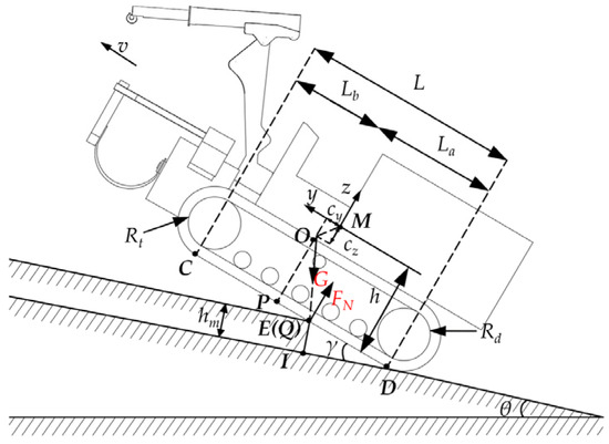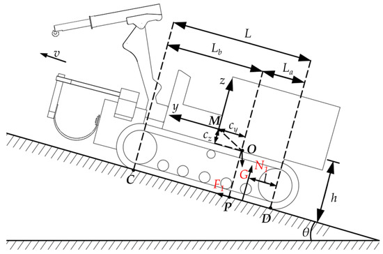 In Equation (5), l is the distance between the rear edge point D of the track support surface and the support force N1. La is the longitudinal distance from the center of gravity to the rear edge point D of the track support surface. cy is the offset distance of the center of gravity relative to the centroid along the longitudinal y-axis. cz is the offset distance of the center of gravity relative to the centroid along the vertical z-axis.