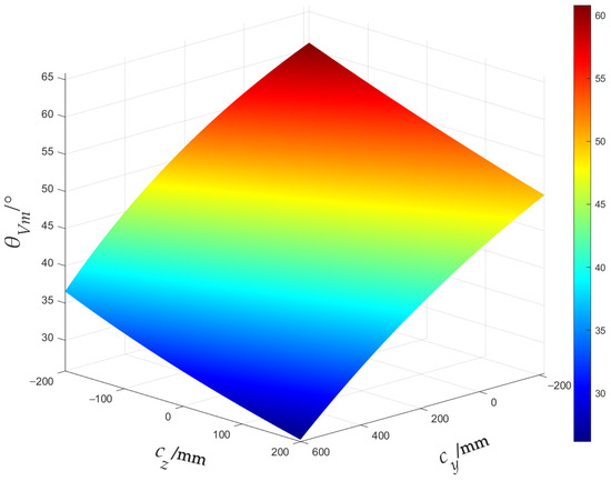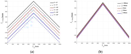 From Equations (9) and (10), show that the primary factors influencing Le-max include θ and the position of the center of gravity. By substituting the structural parameters into the equations and using MATLAB R2021a software, the variation curves of Le-max with θ, La (cy), and cz are generated, as shown in Figure 11a,b.