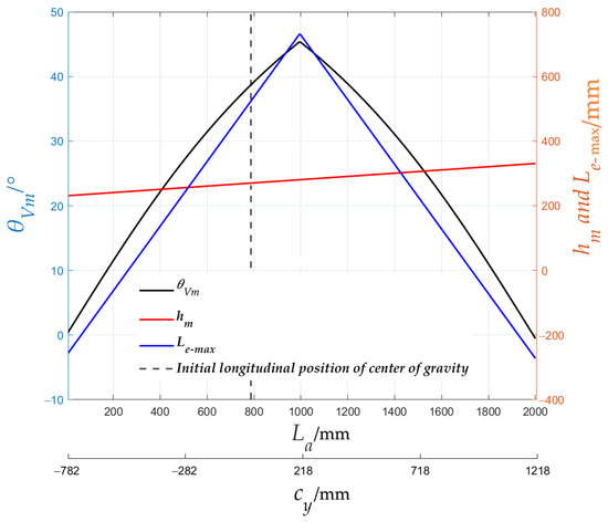 In Figure 12, the vertical dashed line indicates the original relative position of the center of gravity in the horizontal direction. Combined with Figure 5 and Figure 6, it can be concluded that when cy = 212 mm, i.e., when updated La is approximately 1000 mm, θVm, hm, and Le-max reach their maximum values, resulting in optimal driving performance.