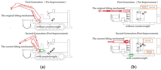 In the first-generation prototype, the lifting device was relatively large in volume and heavy in weight, causing the center of gravity to shift towards the track centerline on the side of the lifting device. This resulted in a reduction of θL-max and decreased lateral stability. Considering that the operating environment of the tree transplanting machine does not require lifting saplings with root ball diameters more significant than 80 cm, and that the existing lifting device is not flexible in operation, there is room for structural optimization. While meeting its rated lifting weight, the operating range of the lifting device can be reduced and structural design redundancies minimized to enhance the overall lateral stability of the machine. This makes the machine lighter and more flexible, better suited for lifting saplings in hilly and mountainous areas. Concurrent with these modifications, alterations were implemented in the distribution locations of the fuel and hydraulic oil tank on the same side as the lifting device. The fuel tank and hydraulic oil tank of the machine weigh 43 kg and 85.5 kg, respectively. When the fuel tank moves forward, the center of gravity of the machine shifts forward. When the fuel tank shifts to the side opposite the lifting device, the center of gravity of the machine shifts towards the centerline of the track on the side opposite the lifting device. The fuel tank is reinstalled on the side of the lifting device, and the hydraulic oil tank is reinstalled on the side opposite the lifting device. The fuel tank was placed on the lifting device side and the hydraulic oil tank on the non-lifting device side. As a result, the θL-max is increased, further enhancing the overall lateral stability of the machine.