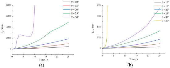It can be observed from Figure 15 that as θ increases, the Lx of the prototypes gradually increases. When the first and second-generation prototypes travel laterally on slopes of 10° to 25° at the same speed, the body offset changes little, resulting in relatively stable movement and a low likelihood of overturn. Specifically, the Lx values for the optimized second-generation prototype at 20° and 25° are 1705 mm and 3285 mm, respectively. The Lx values represent 186 mm and 1646 mm reductions compared to the first-generation prototype. When both prototypes traveled on 30° and 35° slopes, they experienced sudden skidding and lateral overturning. The θL-max for the second-generation prototype was found to be 30°, while for the first-generation prototype, it was 25°, which is generally consistent with the theoretical analysis results. The simulation results indicate that the tree transplanting machine exhibits low lateral adhesion on a slope of 35°, which renders it susceptible to overturning. For safety reasons, the machine should travel laterally on slopes less than 30°.