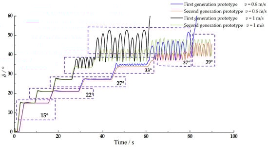 Based on the results obtained from the theoretical analysis above, step models were sequentially created in increasing order. The step heights are 150, 200, 250, 280, 320, and 340 mm. The step width is 500 mm, and the length is 1000 mm. The slope angle is 10°. The travel speeds are set at 0.6 m/s and 1 m/s. The resulting δ fluctuation curves are shown in Figure 19.