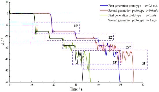 According to Figure 16, when the prototype ascends slopes at different speeds, the pitch angle variation during low-speed climbing is relatively small, indicating a higher stability in climbing. When the prototype ascends slopes of 15° to 27°, the δ fluctuations are minimal, resulting in stable travel. However, when both generations of prototypes ascend slopes of 37° and 39°, respectively, they exhibit a phenomenon of skidding in place and may even experience backward tilting, leading to severe instability. As shown in Figure 17, when the prototype descends slopes of 15° to 22°, the δ fluctuations are again minimal. When both generations of prototypes travel on 33° and 35° slopes, they exhibit forward tilting and reach the climbing limit. The simulation results show reasonable deviation compared to the theoretical results, meeting the driving performance requirement of θVm ≥ 30°.