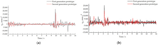 The longitudinal ay fluctuation curve of the prototype. (a) The ay fluctuation curve of the prototype during uphill travel. (b) The ay fluctuation curve of the prototype during downhill travel.