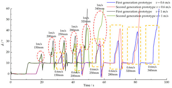 According to Figure 19, both generations of prototypes could traverse a step height of 280 mm successfully. When both generations of prototypes crossed steps with heights of 320 mm and 340 mm at the same speed, a sudden change in δ occurred, leading to the prototypes tilting backward. The hm values for the two generations of prototypes were found to be 280 mm and 320 mm, which are generally consistent with the theoretical analysis results and meet the hm ≥ 270 mm driving performance requirement. When the prototypes traversed the steps at a speed of 1 m/s, there was significant variation in δ, resulting in poor chassis stability and a high risk of overturning. Therefore, a lower speed should be used when crossing steps.