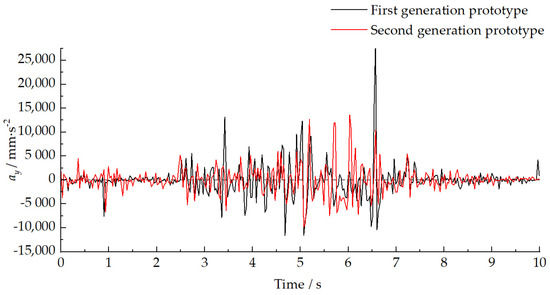 The prototype was tested at a slope angle of 10°, with a hm of 260 mm and a driving speed of 0.6 m/s, and the ay fluctuation curve during step traversal was verified, as shown in Figure 20.