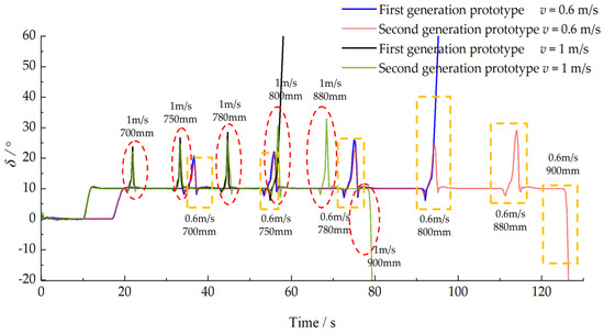 According to Figure 21, both generations of prototypes were able to traverse a trench width of 780 mm successfully. However, when the two generations of prototypes crossed trenches with widths of 800 mm and 900 mm, a sudden change in δ occurred, causing the prototypes to fall into the trenches. The Le-max for the two generations of prototypes was determined to be 780 mm and 880 mm, which are generally consistent with the theoretical analysis results and meet the driving performance requirement of Le-max ≥ 850 mm.