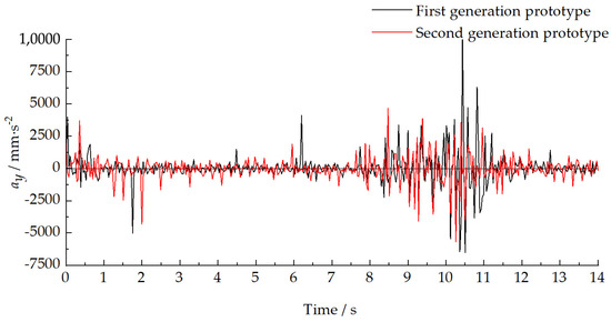 A slope with an angle of 22° was set to verify its stability during climbing, and a driving speed of 0.6 m/s was used. The ay fluctuation curves for the prototype during uphill and downhill travel were obtained, as shown in Figure 18.