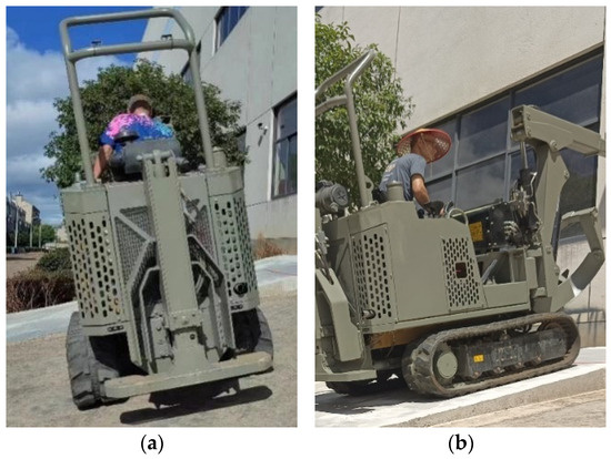 The optimized second-generation prototype was processed and assembled. Referring to standards. Referring to standards such as GB/T15833—2007 and GB/T12541-2023 [28,29], performance tests of the second-generation prototype were carried out in July and August 2024 at the testing grounds of Zhejiang Sifang Co. Ltd. (Jinhua, China) and Zhejiang Yongkang Forest Farm. The test contents included transverse driving on slopes, longitudinal driving on inclined surfaces, step climbing, and trench crossing. The testing equipment included measuring tapes, a stopwatch, a soil firmness testing instrument, and an angle measuring device.