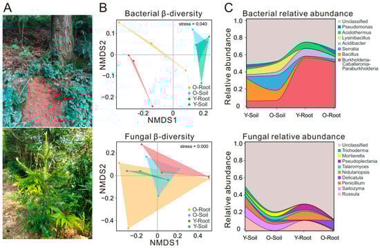 Sample collection, NMDS analysis, and relative abundance of bacteriome and mycobiome from below-ground tissues of Chinese fir for young and old trees. (A) Sampling sites for old and young trees. (B) NMDS (non-metric multidimensional scaling) analysis of bacterial and fungal β-diversity of all samples, NMDS stress = 0.077/0.000. (C) Relative abundance of bacterial and fungal genera of all samples from amplicon analysis. O-Soil: Non-rhizosphere soil of old trees. Y-Soil: Non-rhizosphere soil of young trees. Y-Root: Root of young trees. O-Root: Root of old trees.