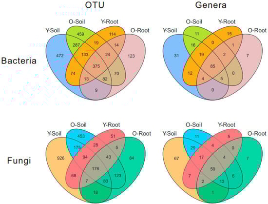 Venn diagrams of OTU and genus grouping of bacterial and fungal biota. O-Soil: Non-rhizosphere soil of old trees. Y-Soil: Non-rhizosphere soil of young trees. Y-Root: Root of young trees. O-Root: Root of old trees.