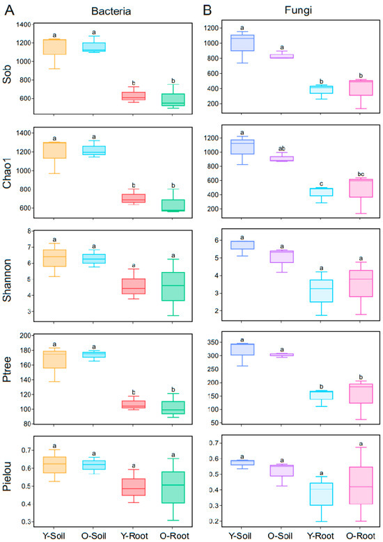 The indices of the α-diversity of bacterial and fungal communities in four different groups of samples. Tukey’s Honestly Significant Difference (HSD) test was implemented to calculate the difference among indices. (A) Diversity analysis of bacterial communities in non-rhizosphere soil and root samples, including Y-Soil (non-rhizosphere soil of young trees), O-Soil (non-rhizosphere soil of old trees), Y-Root (root of young trees), and O-Root (root of old trees). (B) Diversity analysis of fungal communities in the same sample groups. O-Soil: Non-rhizosphere soil of old trees. Y-Soil: Non-rhizosphere soil of young trees. Y-Root: Root of young trees. O-Root: Root of old trees. Different letter on top of bars indicate significant difference.