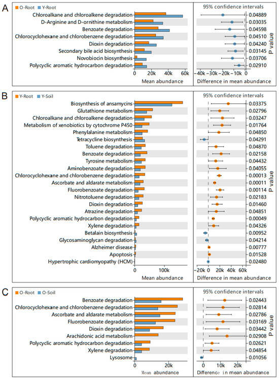 A pairwise comparison of the metabolic activity of bacterial functions. Function prediction of the ITS amplicon was performed using PICRUSt 2.1.4. Welch’s t-test was applied to the pairwise comparison of metabolic activity from the KEGG database (level 3). Functional predictions of microbial communities based on KEGG pathway analysis. (A) Predicted pathways of bacterial communities in O-Root and Y-Root. (B) Predicted pathways of bacterial communities in Y-Root and Y-Soil. (C) Predicted pathways of bacterial communities in O-Root and O-Soil. The bar plots show the mean abundance of KEGG pathways, while the dot plots show differences in mean abundance with 95% confidence intervals. Pathways with significant differences (p < 0.05) are highlighted. O-Soil: Non-rhizosphere soil of old trees. Y-Soil: Non-rhizosphere soil of young trees. Y-Root: Root of young trees. O-Root: Root of old trees.