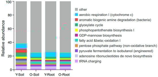 The relative abundance of the predicted functions of fungal communities. Function prediction of the ITS amplicon was performed using PICRUSt 2.1.4, with the top 10 abundance shown. The predicted functions involved aromatic biogenic amine degradation, glyoxylate cycle, GDP-mannose biosynthesis, and tRNA charging among four different group of samples. O-Soil: Non-rhizosphere soil of old trees. Y-Soil: Non-rhizosphere soil of young trees. Y-Root: Root of young trees. O-Root: Root of old trees.
