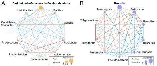 Genus-level abundance correlations of different (A) bacteria and (B) fungi within four different groups of samples. The area of the circular pattern indicates the abundance of the genus in the sample. Red lines indicate positive effects, and blue lines indicate negative effects. Names of the keystone genus were in bold.