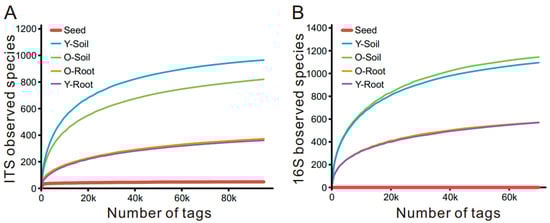 The number of observed species with the increase in tags of (A) fungi and (B) bacteria in Chinese fir seeds and four below ground groups. O-Soil: Non-rhizosphere soil of old trees. Y-Soil: Non-rhizosphere soil of young trees. Y-Root: Root of young trees. O-Root: Root of old trees. The information of the seed was highlighted in red and thick lines.