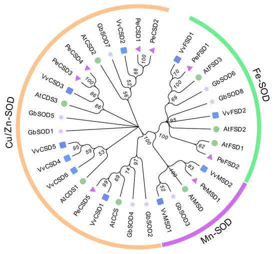To elucidate the evolutionary relationships among the various GbSOD members, a phylogenetic tree was constructed based on the amino acid sequences from grape (Vitis vinifera L.) (10 VvSODs), Euphrates poplar (Populus euphratica O.) (8 PeSODs), and Arabidopsis (8 AtSODs). The phylogenetic tree revealed that the SOD proteins from four species could be divided into three distinct subgroups: Fe-SOD, Cu/Zn-SOD, and Mn-SOD, consistent with their respective metal cofactors (Figure 1). The Fe-SOD subgroup comprised nine members (two GbSODs, three AtSODs, one PeSOD, and three VvSODs), the Mn-SOD subgroup had five members (one GbSOD, one AtSOD, one PeSOD, and two VvSODs), and the Cu/Zn-SOD subgroup included twenty members (five GbSODs, four AtSODs, five PeSODs, and six VvSODs). Specifically, the ginkgo genome contained one GbMSD (GbSOD1), two GbFSDs (GbSOD6 and GbSOD8) and five GbCSDs (GbSOD1, GbSOD2, GbSOD4, GbSOD5, and GbSOD7). Furthermore, it was evident that the Fe-SOD subfamily and Mn-SOD subfamily exhibited closer relationships than the Cu/Zn-SOD subfamily, suggesting that the Fe-SOD subfamily and Mn-SOD subfamily might share a common ancestor through replication but underwent divergence over an extended evolutionary history.