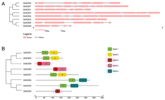 The gene structure characteristics of the GbSOD gene family. (A) The distribution of coding sequences in GbSODs are represented by pink boxes. (B) The conserved structural domains of GbSODs.