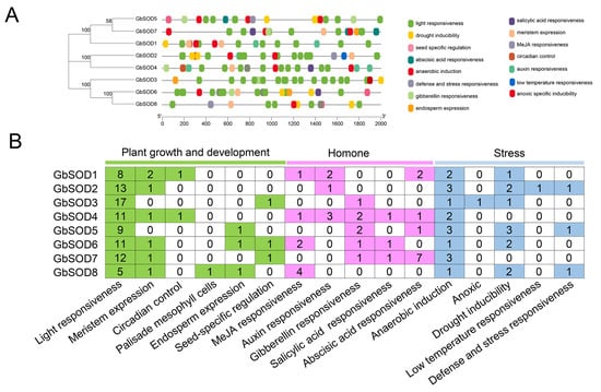 Cis-element analysis of GbSODs. (A) Enrichment of cis-acting elements in promoter regions of GbSODs, with various colors indicating different element counts. (B) Characteristics of different cis-elements in promoter regions of GbSODs.