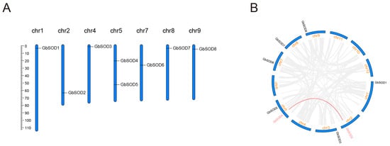 The chromosomal localization and collinearity analysis of the GbSOD gene family. (A) Eight GbSODs were mapped to distinct chromosomes. (B) Red lines are used to denote the syntenic GbSOD gene pairs.