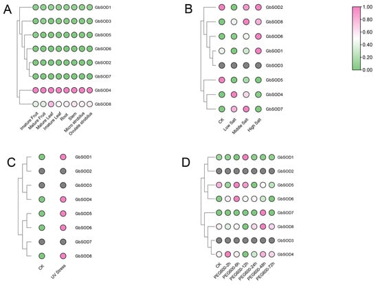 To investigate the potential roles of GbSODs, we analyzed their expression patterns across various tissues using RNA-Seq data. Eight distinct tissues, including immature leaf, mature leaf, immature fruit, mature fruit, root, stem, micro strobilus, and ovulate strobilus, were selected for analysis (Figure 5A). The expression profiles showed that eight GbSODs were expressed in these eight different tissues, although most of the GbSODs did not exhibit high expression levels. Notably, GbSOD4 and GbSOD8 were relatively highly expressed in all examined tissues.