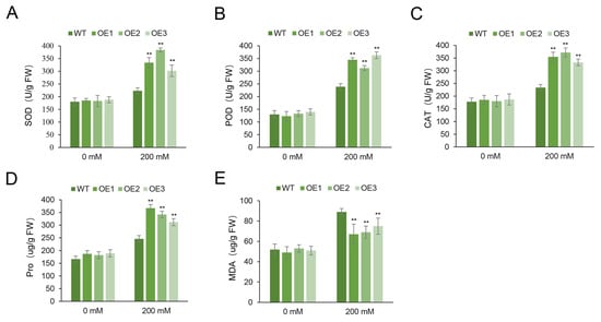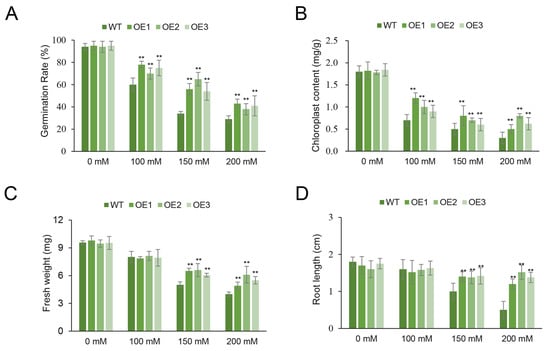 To perform germination tests, Arabidopsis seeds from both transgenic lines and control groups were subjected to salt stress conditions of 0, 100, 150, and 200 mM NaCl. After two days of stratification at 4 °C, germination was defined as the emergence of a radicle from the seed coat. Following ten days of culture, different phenotypic characteristics (root length, fresh weight and chloroplast content) were measured. Additionally, the antioxidant enzyme (SOD, POD, and CAT) activities and the total chlorophyll content, malondialdehyde (MDA), and proline (Pro) contents were determined using Solarbio kits (Solarbio, Bejing, China) with three biological replicates.