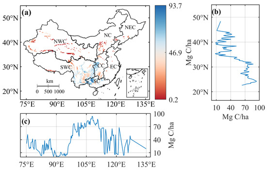 In terms of latitudinal distribution, AGC density showed a decreasing trend with increasing latitude. The observed AGC density peaked at 93.73 Mg C/ha between 24° N and 25° N, while the lowest density of 7.73 Mg C/ha was approximately at 35° N (Figure 2b). Regarding longitudinal distribution, the highest AGC density of 93.73 Mg C/ha was found between 107° E and 108° E, while the lowest density of 1 Mg C/ha was observed between 88° E and 89° E.