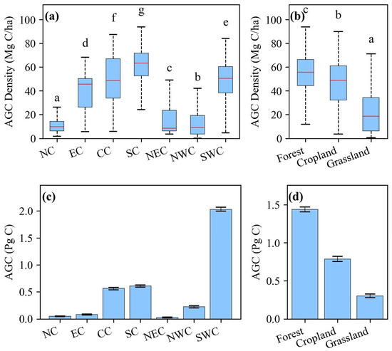 Variations in AGC density across different geographic regions (a) and land-use types (b), as well as AGC stock distribution (c,d). Letters a–g indicate that identical letters represent no significant difference, while different letters indicate a significant difference (). Error bars represent the standard deviation (std).