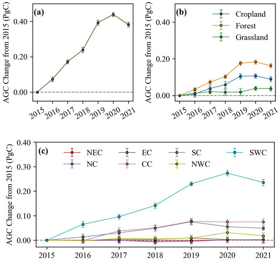 Dynamic changes in AGC from 2015 to 2021. (a) Yearly AGC changes across the study region. (b) Yearly AGC changes across different land-use types. (c) Yearly AGC changes across seven geographical regions. Error bars represent the standard deviation (std).