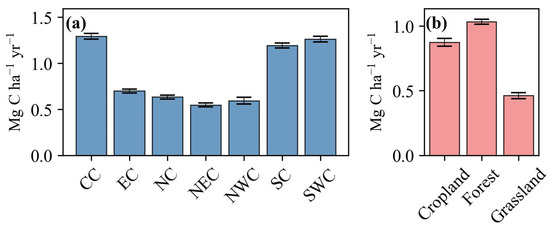 In terms of AGC density, the net change in AGC density across the study region was 0.73 Mg C ha−1 yr−1. Regionally, the highest net change in AGC density was observed in Central China, reaching 1.29 Mg C ha−1 yr−1, followed by Southwest China with a value of 1.26 Mg C ha−1 yr−1(Figure 5a). In terms of land-use types, forests exhibited the largest net change in AGC density at 1.03 Mg C ha−1 yr−1, followed by croplands at 0.87 Mg C ha−1 yr−1, while grasslands showed the lowest value at 0.46 Mg C ha−1 yr−1 (Figure 5b).