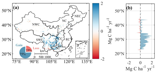 Spatial changes in AGC density in the karst regions of China from 2015 to 2021. (a) Net AGC density change during 2015–2021. (b) Latitudinal variation in net AGC density change from 2015 to 2021.