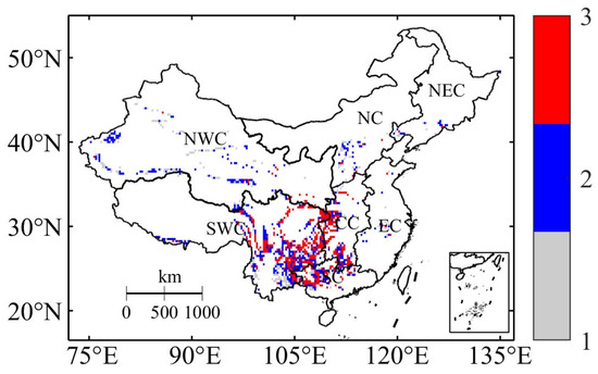 AGC trends in China’s karst regions from 2015 to 2021. Categories were defined based on the criteria outlined in Table A3, where 1 indicates a non-significant trend, 2 represents a slightly significant increase, and 3 denotes a significant increase.