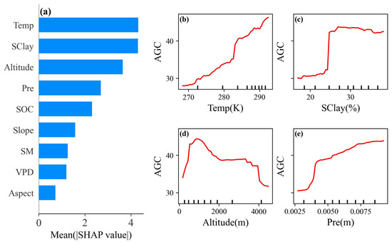 Impact of environmental factors on AGC: SHAP values and partial dependence. (a) Bar chart displaying these average magnitudes of SHAP values for each environmental factor. (b–e) The marginal effect on AGC of Temp (b), SClay (c), Altitude (d), and Pre (e). The lines illustrate the average response in the random forest model for a specific variable, keeping the other variables at different values.