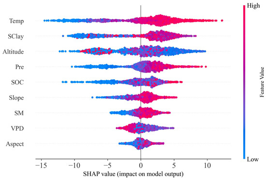 We utilized the TreeExplainer SHAP framework, introduced by Lundberg et al. [68], to generate localized interpretations of RF models and analyze the effects of environmental factors on AGC. The SHAP method is based on the Shapley value concept from game theory [69], which can be viewed as an improvement over the local interpretable model-agnostic explanations approach [70]. The importance of each feature was determined by calculating the average of its absolute SHAP values, providing a clear measure of their impact. To gain a deeper understanding of how features in the dataset influence the model’s output, a bee swarm plot is utilized to provide a densely informative visualization of the impact of each feature on the model’s predictions. In this context, positive SHAP values indicate an increase in AGC predictions, while negative values indicate a decrease caused by the feature.