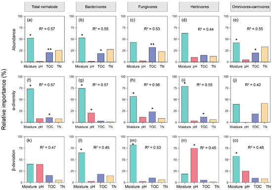 Linear mixed models and variance partitioning were used to identify the determinants of the soil nematode abundance and diversity. Soil moisture was the primary driver of the nematode abundance across all trophic groups (R2 ranging from 0.44 to 0.57; Figure 3a–e). Its relative importance exceeded 50% for the total nematodes, bacterivores, and herbivores (Figure 3a–e). Notably, the TOC significantly affected the abundance of total nematodes, bacterivores, fungivores, and omnivores–carnivores, while the pH showed a limited influence. The α-diversity of the nematode communities was predominantly regulated by the soil moisture (average relative importance >60%, R2 between 0.42 and 0.57, Figure 3f–j). For the total nematodes, fungivores, and herbivores, the soil TOC had a significant but secondary effect. Moisture remained the most influential factor in the β-deviation (R2 = 0.45–0.53; Figure 3k–o). Interestingly, the pH played a critical role in certain groups, such as herbivores (relative importance = 73.5%; Figure 3n).
