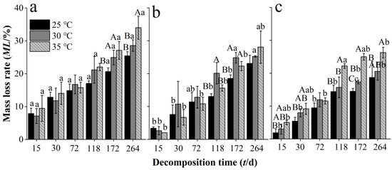 Mass loss rate of Chinese fir needle litter at different developmental stages at different temperatures during the decomposition experiment for the different developmental stages: (a) middle-aged, (b) mature, and (c) overmature stands. Bars show mean values and error bars represent standard deviation (n = 3). Different uppercase letters indicate significant differences among temperatures at the same developmental stage at each decomposition time (p < 0.05). Different lowercase letters indicate significant differences among developmental stages at the same temperature treatment at each decomposition time (p < 0.05). Letters are shown only where there are significant differences.