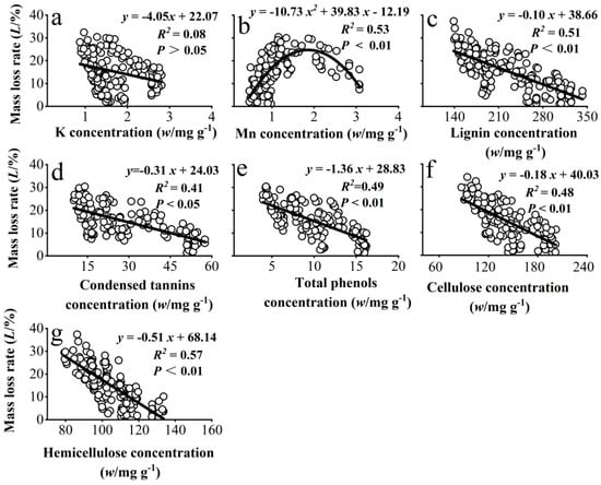 Fitted relationships between the mass loss rate of needle litter and the concentrations of K and Mn (a,b) and the recalcitrant components (c–g) in needle litter across all developmental stages, temperatures, and decomposition periods in the experiment.