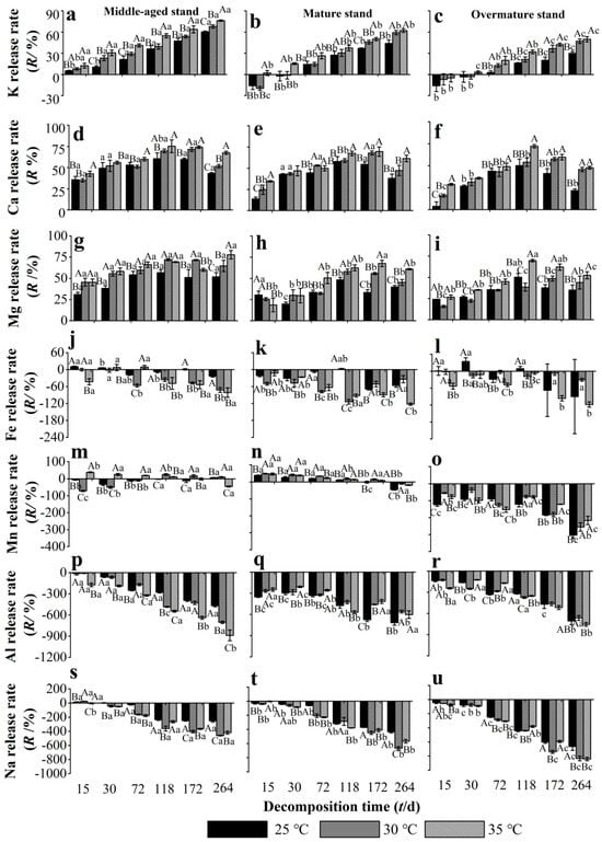 Release rate of metallic elements from Chinese fir needle litter at different temperatures during the decomposition experiment at different developmental stages. (a–c) represent the K release rate of middle-aged, mature, and overmature stands, respectively; (d–f) represent the Ca release rate of middle-aged, mature, and overmature stands, respectively; (g–i) represent the Mg release rate of middle-aged, mature, and overmature stands, respectively; (j–l) represent the Fe release rate of middle-aged, mature, and overmature stands, respectively; (m–o) represent the Mn release rate of middle-aged, mature, and overmature stands, respectively; (p–r) represent the Al release rates of middle-aged, mature, and overmature stand, respectively; (s–u) represent the Na release rates of middle-aged, mature, and overmature stand, respectively. Bars show mean values and error bars represent standard deviation (n = 3). Different uppercase letters indicate significant differences among temperatures at the same developmental stage at each decomposition time (p < 0.05). Different lowercase letters indicate significant differences among developmental stages at the same temperature treatment at each decomposition time (p < 0.05). Letters are shown only where there are significant differences.