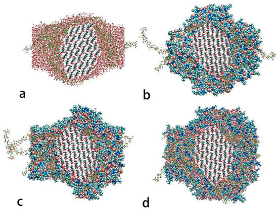 End view of MD systems of CC and AC with (a) 25 wt% water; (b) 25 wt% IL; (c) 25 wt% IL and 12.5 wt% water; (d) 25 wt% IL and 25 wt% water. Well-arranged CC is in the center of each system, surrounded by AC with green carbon atoms; water molecules with small red atoms; and IL molecules with dark blue N atoms, light blue C atoms, and large red Cl atoms.