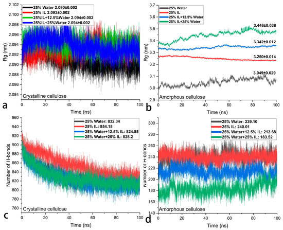 During the dehydration of WAW, the loss of absorbed water below the fiber saturation point usually causes the shrinkage of wood polymers, including cellulose. The key concept of this paper is to partially replace water with ionic liquid (IL) to maintain the stable swollen state of WAW. Amorphous cellulose (AC) is a principal swelling component, and swelling of crystalline cellulose (CC) should be avoided in WAW. The systems, each consisting of 25 AC chains, one CC crystal, and certain amount of water and/or IL (with reference to the weight of AC), were simulated at 298 K, and the end views are shown in Figure 2. The reference system in Figure 2a, consisting of 25 wt% water, shows excess water molecules at the corners that do not directly interact with AC or CC, which suggests a maximum swollen state of AC by water. In the remaining systems, all the [Bmim][Cl] and water molecules fully interact with cellulose through hydrogen bonds and other intermolecular forces. The crystalline structure of CC in all the systems is still well arranged and is not disturbed by [Bmim][Cl]. This can be quantitatively illustrated by the radius of gyration (Rg) and the number of hydrogen bonds within the CC. As shown in Figure 3a, the radius of gyration of CC only increases by 0.003–0.004 nm after [Bmim][Cl] is introduced into the systems, which suggests that IL or the IL–water mixtures does not further swell CC and change its volume or conformation at room temperature. The number of hydrogen bond within the CC is higher in the system containing 25 wt% [Bmim][Cl] in comparison with that in the system containing 25 wt% water (as shown in Figure 3c), while it decrease very slightly when both [Bmim][Cl] and water are present. The above observation suggests that IL [Bmim][Cl], as well as its water mixture, basically do not swell CC at room temperature, and thus it is safe in terms of preventing the unwanted swelling of CC in WAW. Nonetheless, AC seems to be more swelled by IL than by water. The Rg of AC with 25 wt% IL is larger than that with 25 wt% water, and an even higher Rg of AC can be achieved by IL–water mixtures (Figure 3b). The intermolecular hydrogen bonds between the AC chains are almost the same in the systems consisting of 25 wt% water or 25 wt% IL (shown in Figure 3d), revealing a comparable capability to break the AC’s intermolecular hydrogen bonds. As IL is hygroscopic, the IL–water mixture is more capable of breaking these hydrogen bonds when compared with IL or water alone, making it a stronger swelling agent for WAW. These simulation results suggest that, theoretically, IL has the ability to maintain the swollen state of AC, regardless of the amount of water or relative humidity in the surroundings.