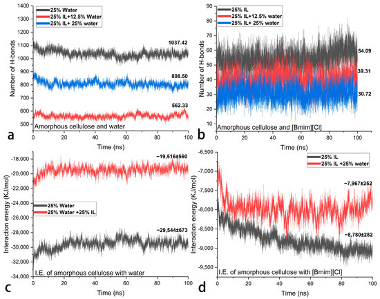 Moreover, water and [Bmim][Cl] are evenly matched in terms of their ability to form hydrogen bonds with AC. Shown in Figure 4a, the number of hydrogen bonds between AC and water drops from 1037.42 in the system containing 25 wt% water to 562.33 in the system containing an additional 25 wt% IL. Meanwhile, the number of hydrogen bonds between AC and IL drops from 54.09 in the system containing 25 wt% IL to 30.72 in the system containing an additional 25 wt% water (in Figure 4b). Last but not least, the interaction energy (IE) of AC with IL is slightly affected by the addition of water (shown in Figure 4d), while the IE of AC with water can be increased much more by the addition of IL (shown in Figure 4c). This suggests that [Bmim][Cl] has a greater affinity for AC than for water due to other intermolecular forces such as induction force, laying the foundation for keeping AC swollen. Although here, the conventional agent PEG was not compared under the same conditions, the previously reported MD calculation and experiments have already shown its strong interaction with cellulose [31,38]. Moisture-induced swelling in the transverse direction slightly increased by increasing the amount of PEG 200 up to 25% [31], which also theoretically suggests that PEG is helpful in achieving dimensional stability by increasing the swollen state. A quantitative comparison may not be very significant because the swelling of cellulose or WAW can be additionally adjusted by modifying the concentration, types of ionic liquids, or molecular weight of PEG, and extensive swelling is unwanted in the conservation of WAW. But if we look to other benefits from ILs, they provide better thermal stability, anti-microbial attributes [39,40], and fire-retardant properties [41,42], making it a better candidate for swelling WAW.