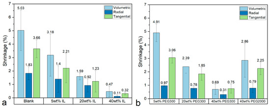 After confirming the ability of IL to swell AC, trials are made to evaluate the practical results in controlling the dimensional stability in comparison with the results for the conventional stabilizing agents PEG 300 and PEG 2000, which are shown in Figure 5. The volumetric shrinkage of the untreated air-dried WAW sample is 5.03%, which shows that it is generally well-preserved. However, 3.66% tangential shrinkage still leads to cracking in the wood planks preserved at the China Port Museum after air-drying. After treating the samples with stabilizing agents and air-drying them at 65 ± 5%RH, 25 °C, both IL [Bmim][Cl] and PEG yield positive and comparable results. The lowest volumetric shrinkage of 0.47% was achieved by 40 wt% IL, closely followed by 0.69% with 40 wt% PEG 300. PEG 2000, of higher molecular weight, is not as effective as PEG 300, probably due to its larger molecular size. As well-preserved WAW does not need PEG to provide mechanical reinforcement, a smaller molecular size would be advantageous for entering pores and gaps of a wider size range, which may be superior for keeping microfibrils or their bundles from getting close to each other. When used in lower concentrations, such as 5 wt% or 20 wt%, PEG 300 is evidently less effective than IL. For instance, 5 wt% PEG 300 treatment reduced volumetric shrinkage to 4.91%, while 5 wt% IL effectively reduce volumetric shrinkage to 3.18%. These observations validate the simulation results showing that IL can swell amorphous cellulose and possibly hemicellulose and lignin like water and the possibility of using IL to maintain dimensional stability.
