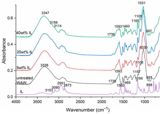 FTIR spectra of untreated WAW and WAW treated with IL.